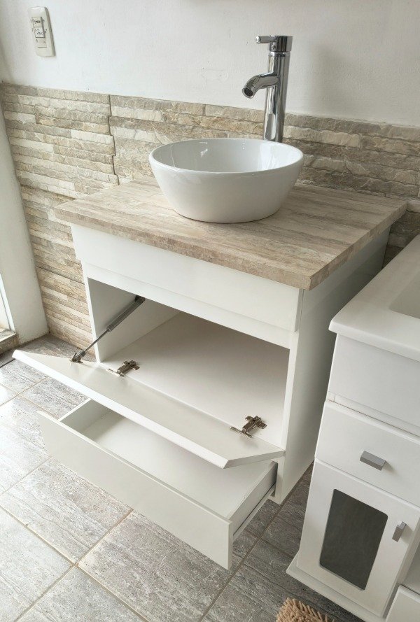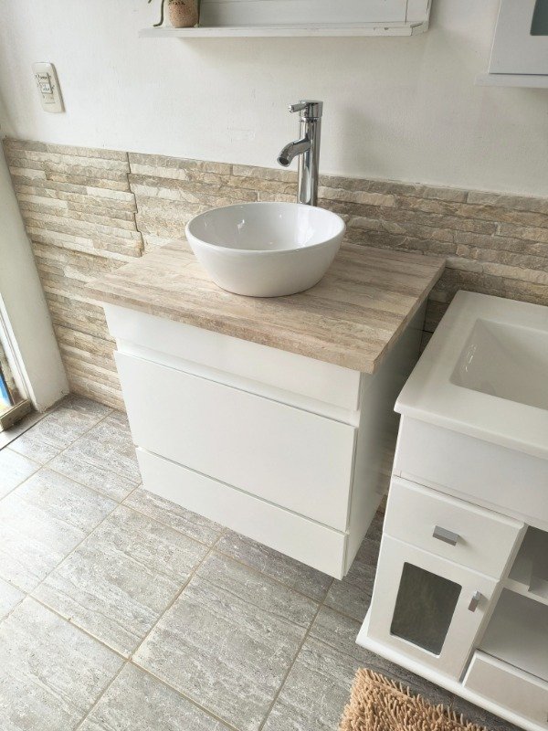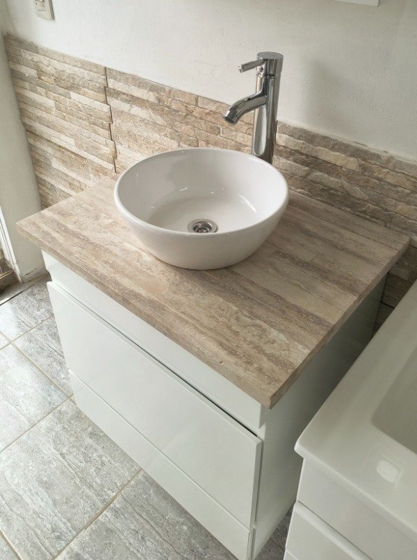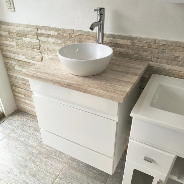 Incluye tapa de mármol travertino natural y bacha de loza marca Daccord, ideal para lograr un estilo sofisticado y funcional.