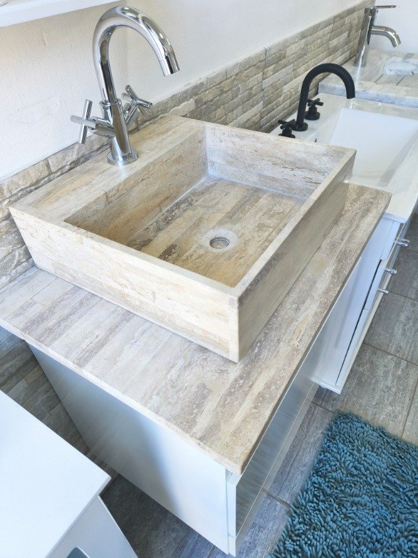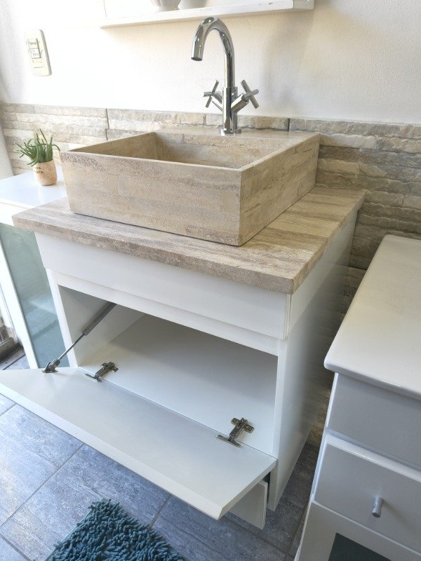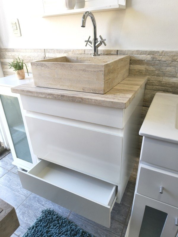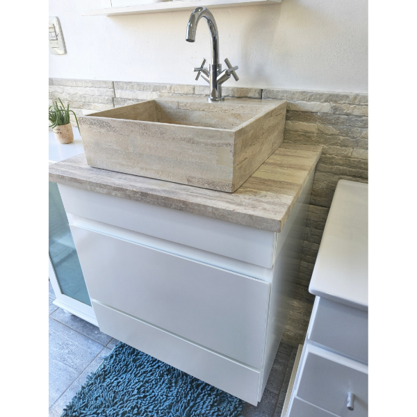 Un conjunto moderno y funcional que transforma tu baño en un espacio elegante y práctico. El vanitory colgante de 60 cm, fabricado en MDF laqueado de alta calidad, incluye una puerta volcable y un cajón para mayor comodidad y organización. La tapa de mármol travertino aporta un acabado sofisticado, mientras que la bacha de apoyar de 40 cm se convierte en el centro de atención.
