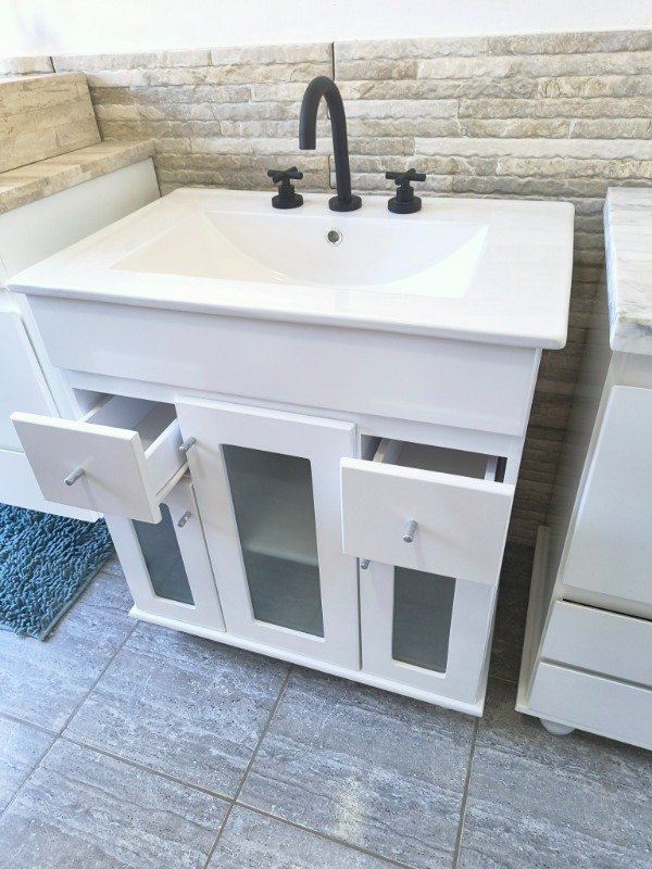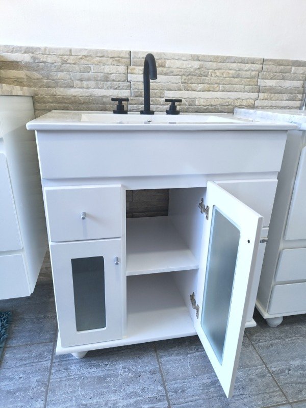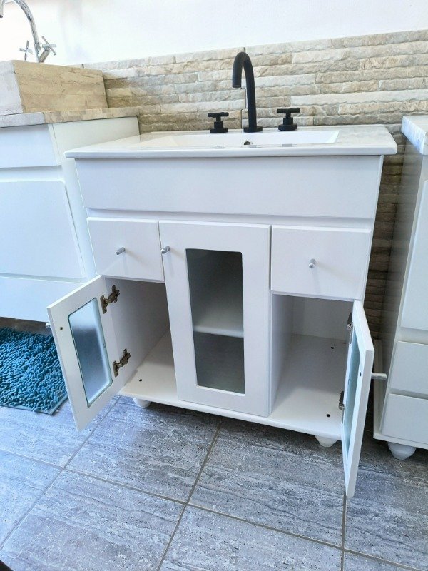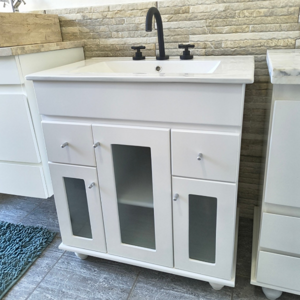 Fabricado en MDF laqueado de alta resistencia, está disponible en color blanco y cuenta con bacha de loza, con opción de 1 o 3 agujeros según la grifería que prefieras. Su diseño incluye 3 puertas vidriadas y 2 cajones espaciosos, brindando funcionalidad y organización en un solo mueble.