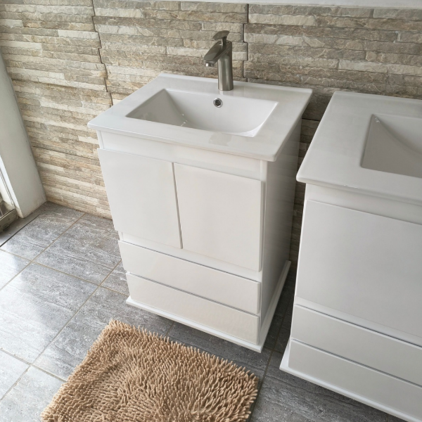 Vanitory de 50 x 40 cm fabricado en madera laqueada color blanco, resistente a la humedad y con un diseño moderno que se adapta a cualquier baño.