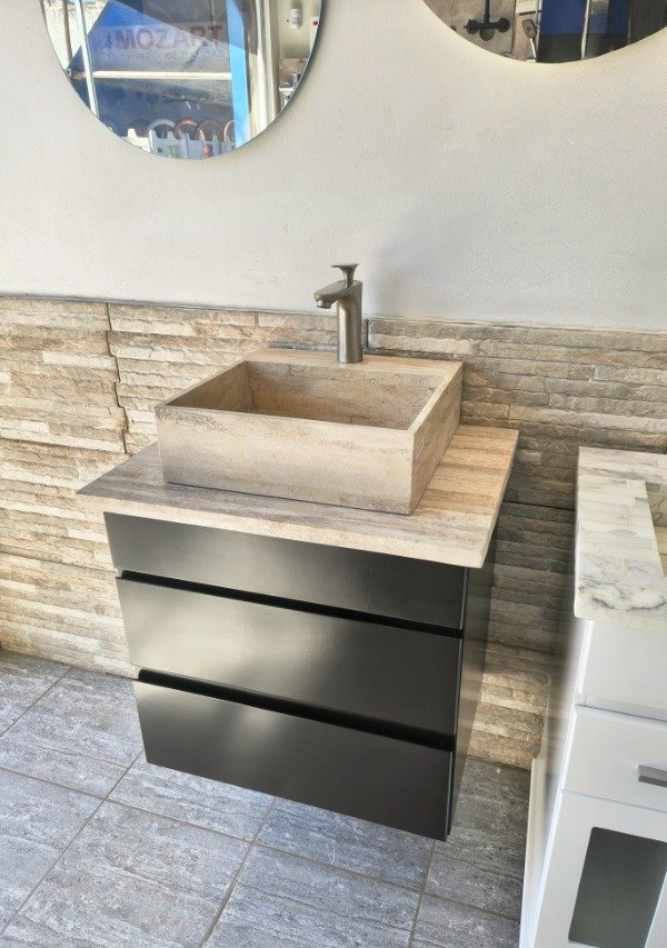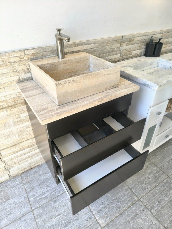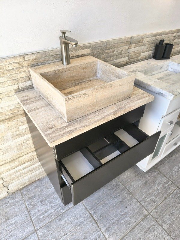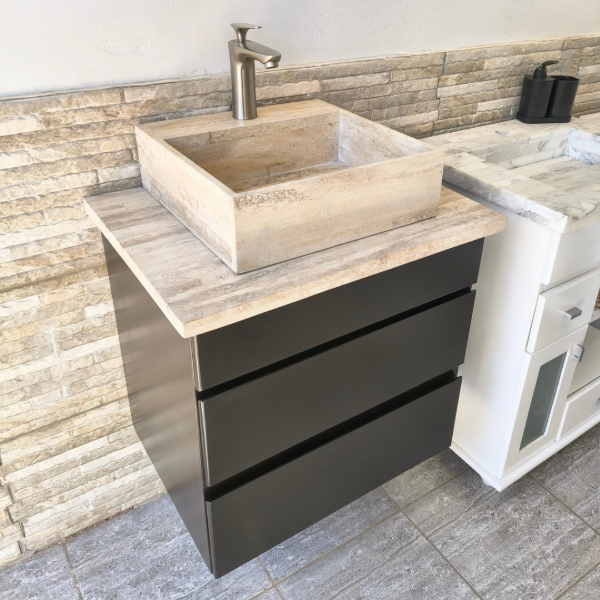 Incluye tapa de mármol travertino natural y bacha de apoyo de 40 x 40 cm, también en mármol travertino.