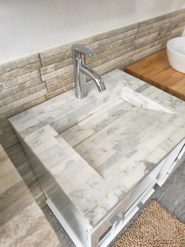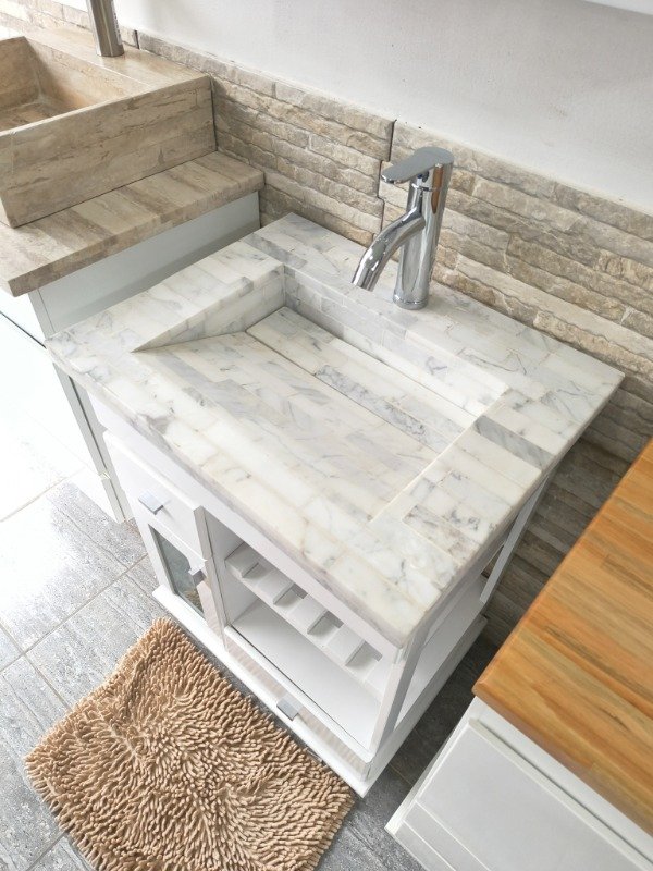 Incluye bacha de mármol Carrara con desagüe oculto, disponible solo con 1 agujero para grifería.