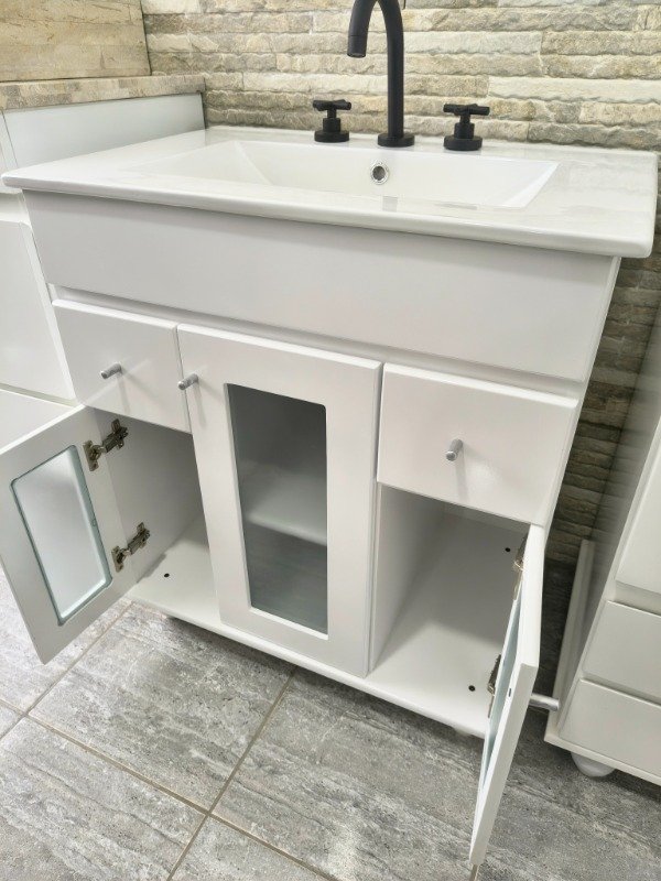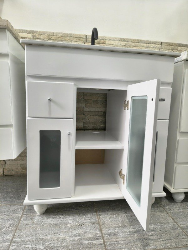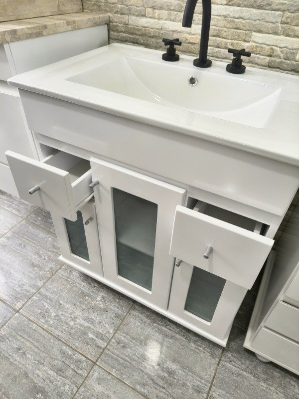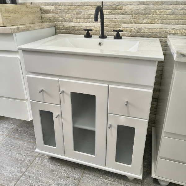 Fabricado en MDF laqueado de alta resistencia, está disponible en color blanco y cuenta con bacha de loza, con opción de 1 o 3 agujeros según la grifería que prefieras. Su diseño incluye 3 puertas vidriadas y 2 cajones espaciosos, brindando funcionalidad y organización en un solo mueble.